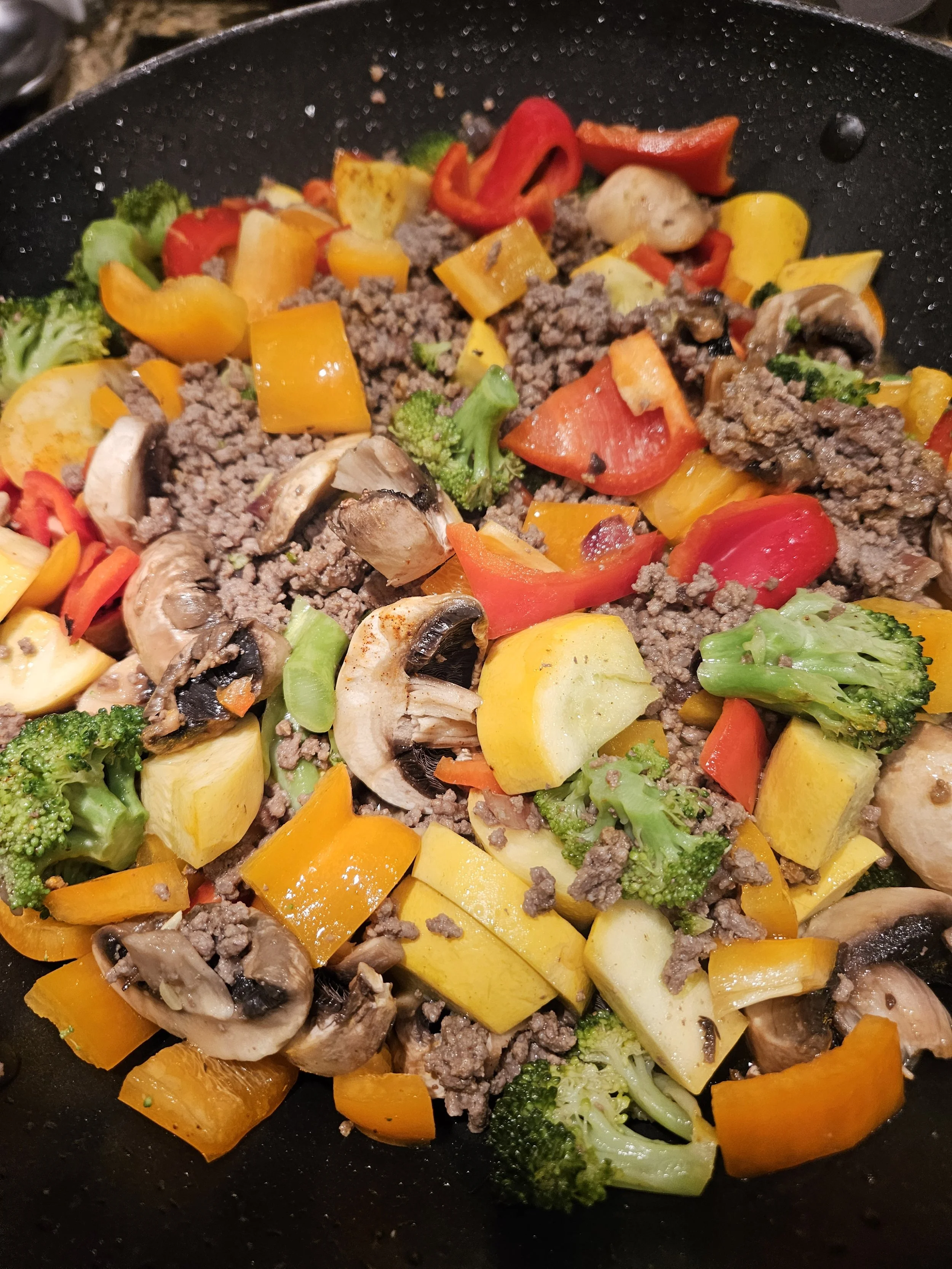 Grassfed lean beef wok sauté with broccoli, red peppers, squash, and mushrooms.