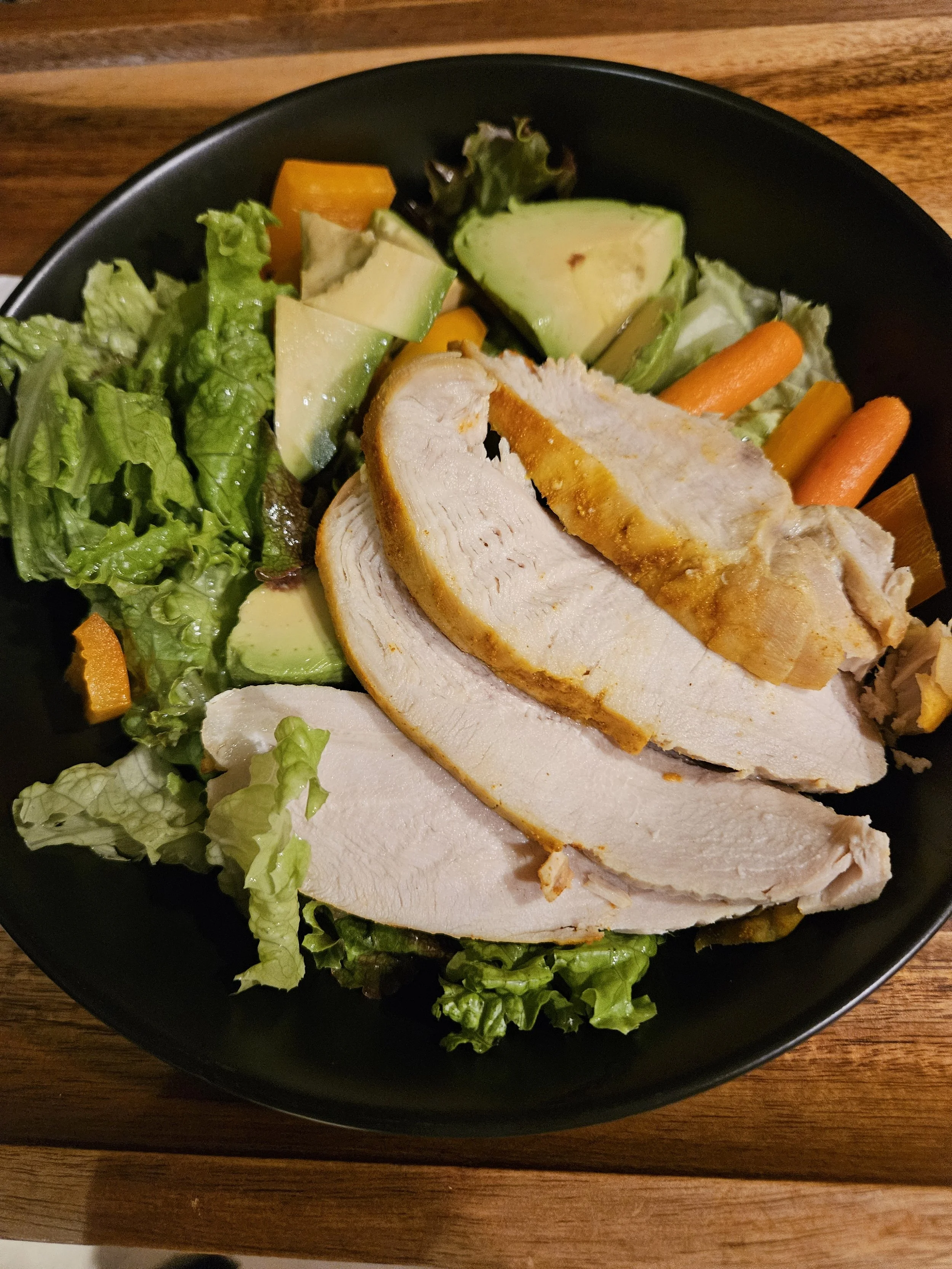 Oven baked or convection air fry chicken breast salad with avocado, red leaf lettuce, carols and orange peppers.
