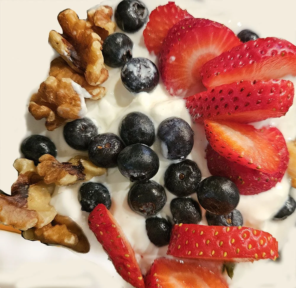 Yogurt at 16 grams of protein per serving, served with blue berries, strawberries, and walnuts.